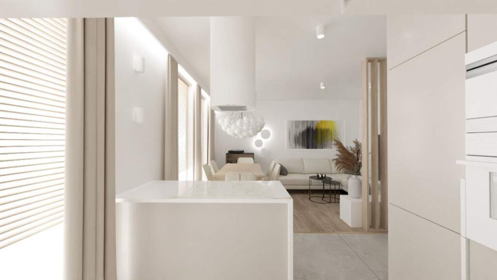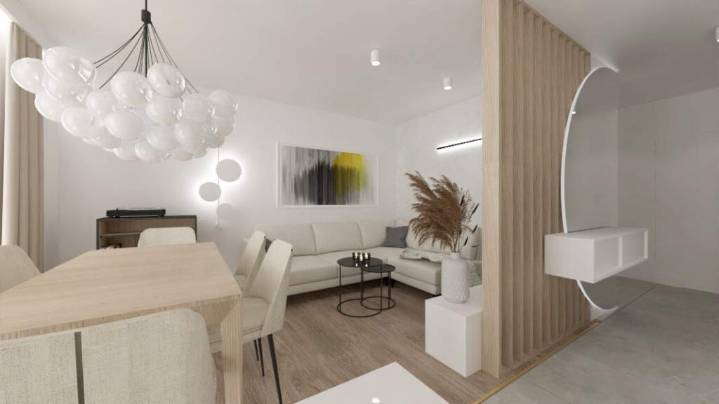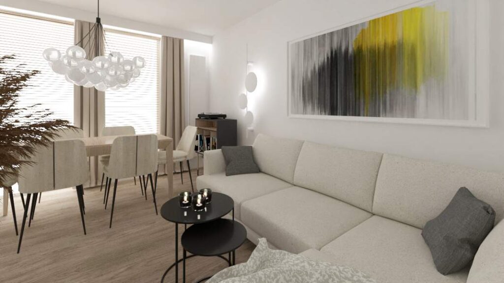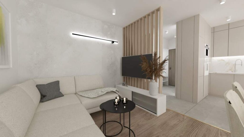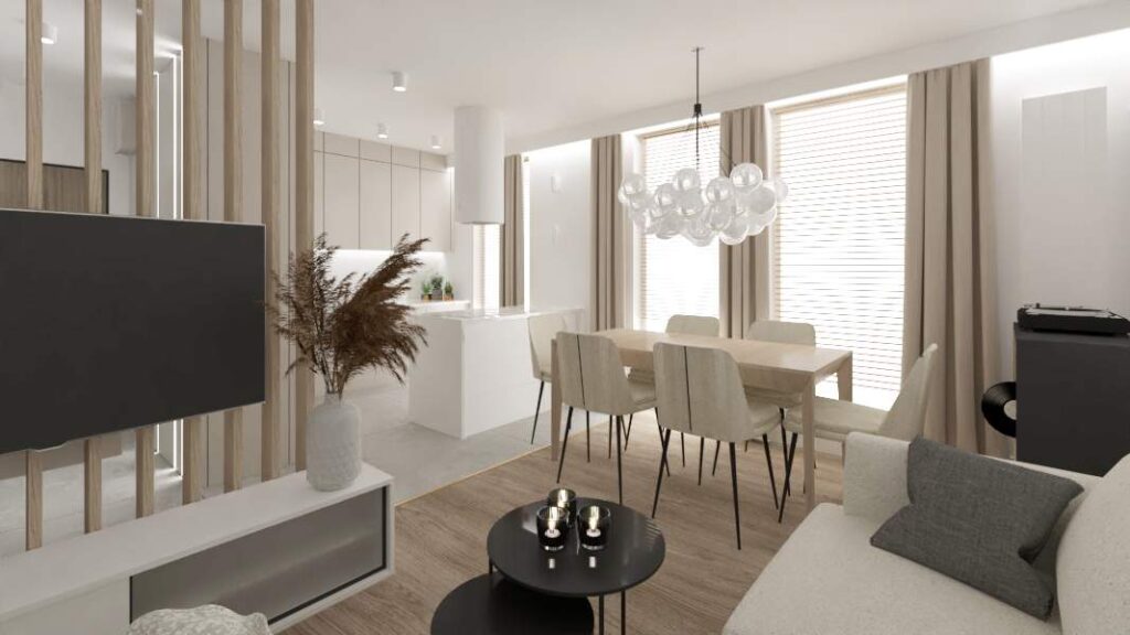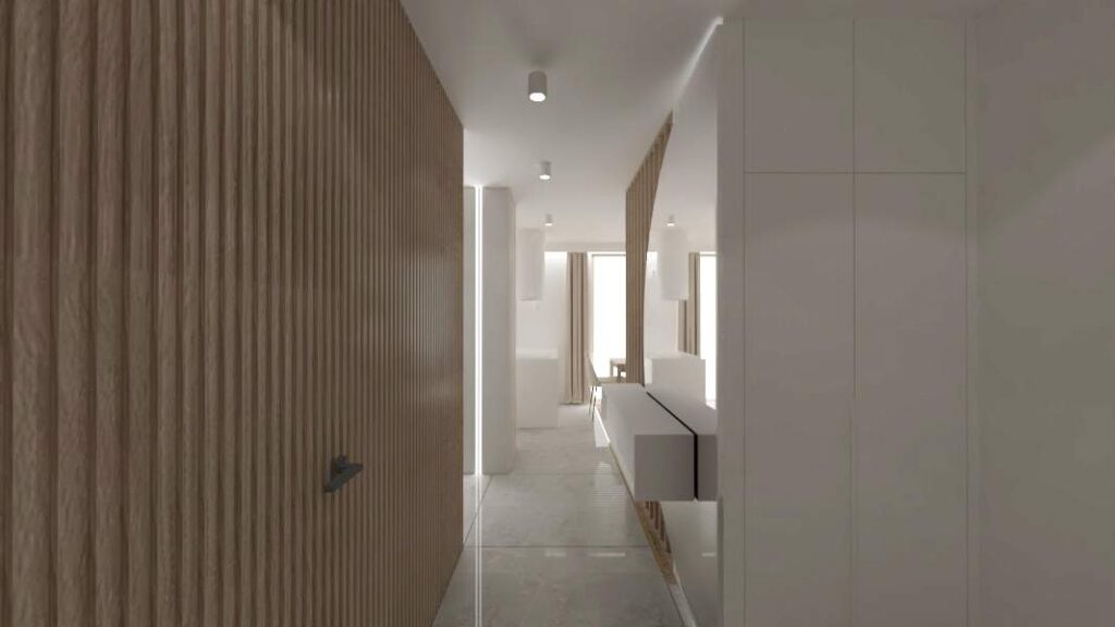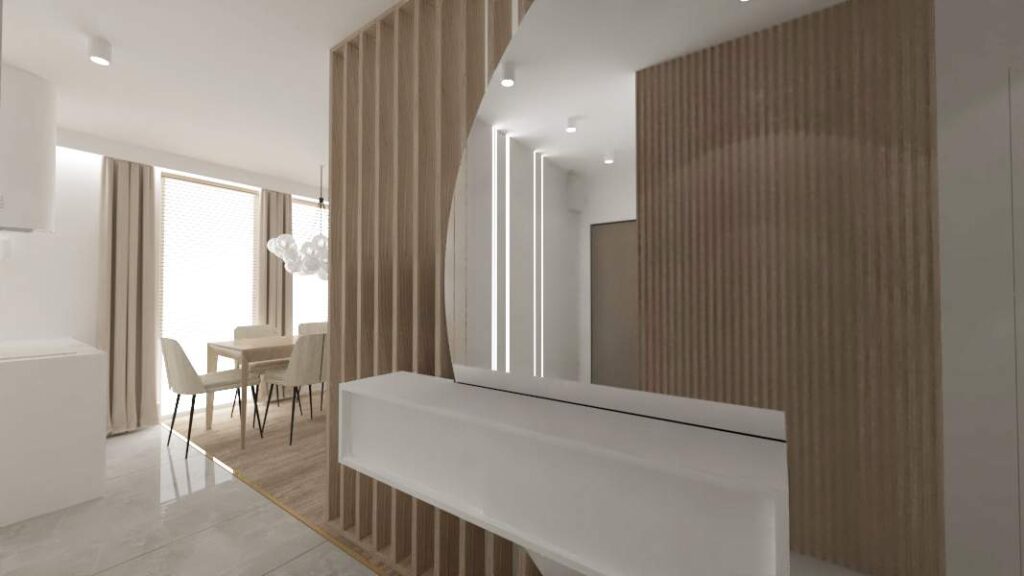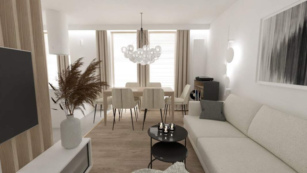 Projekt kompleksowy mieszkania około 60m2 w stylu nowoczesnym – w skład projektu wchodziła strefa wejściowa, korytarz, garderoba, salon z kuchnią, jadalnia, sypialnia oraz łazienka.