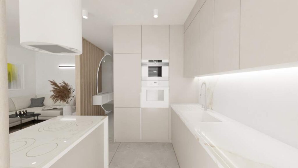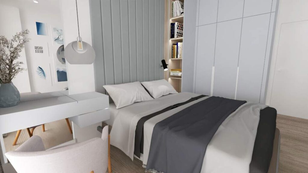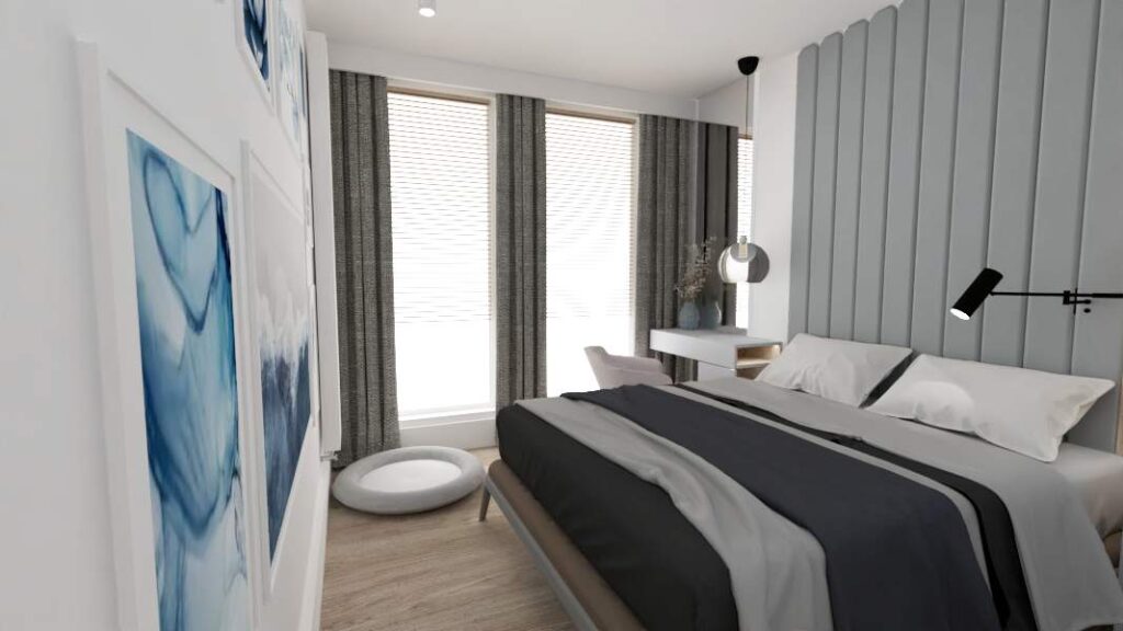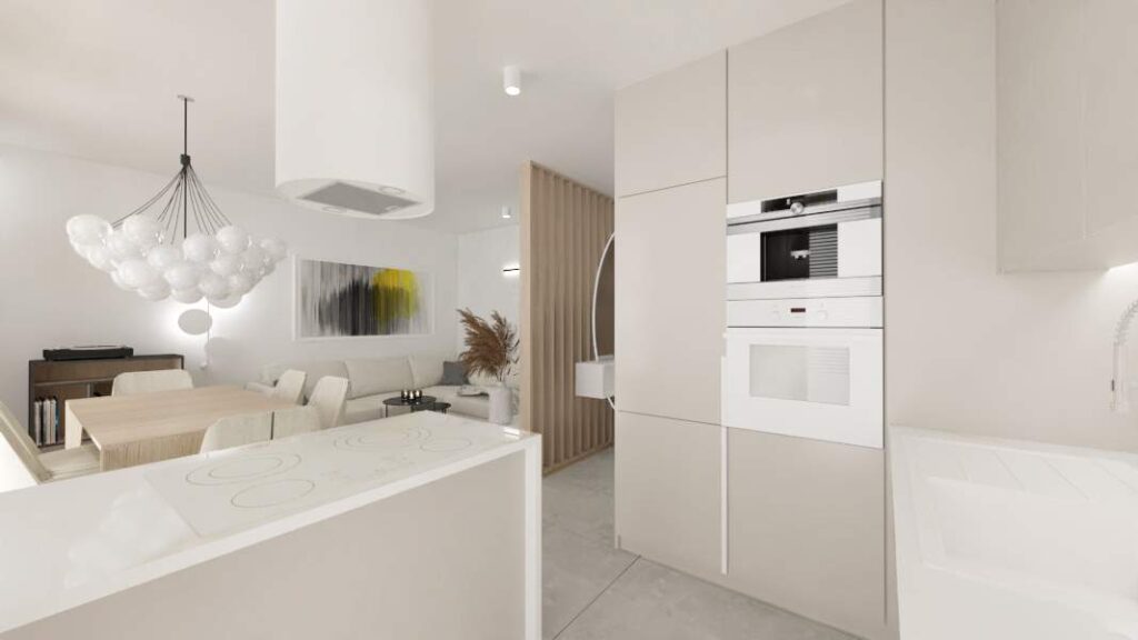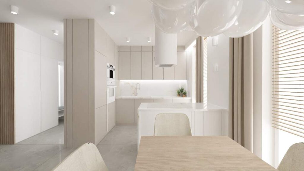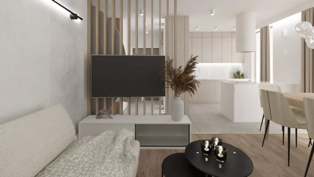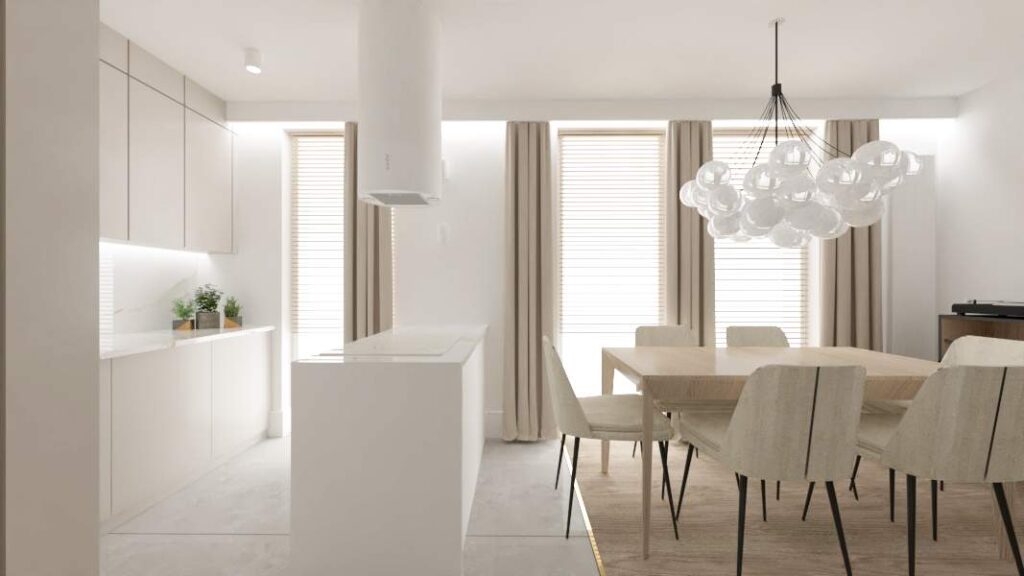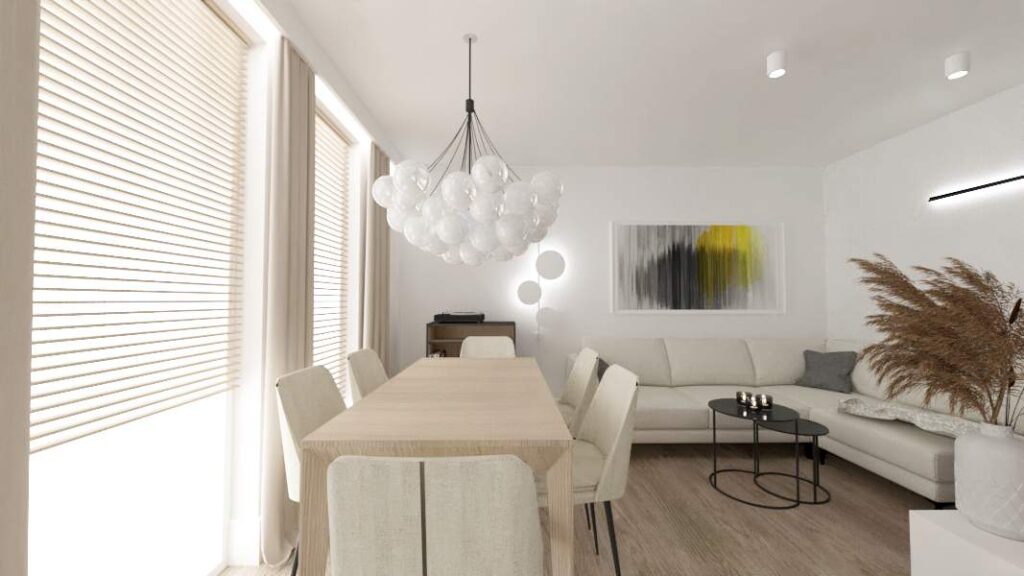 Projekt kompleksowy mieszkania około 60m2 w stylu nowoczesnym – w skład projektu wchodziła strefa wejściowa, korytarz, garderoba, salon z kuchnią, jadalnia, sypialnia oraz łazienka.